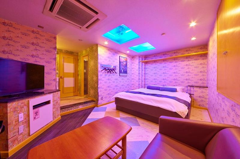 At the love hotel,rooms come with a wardrobe. Each room includes a private bathroom with a shower, free toiletries and a hairdryer. At 藍plus, every room has air conditioning and a flat-screen TV.