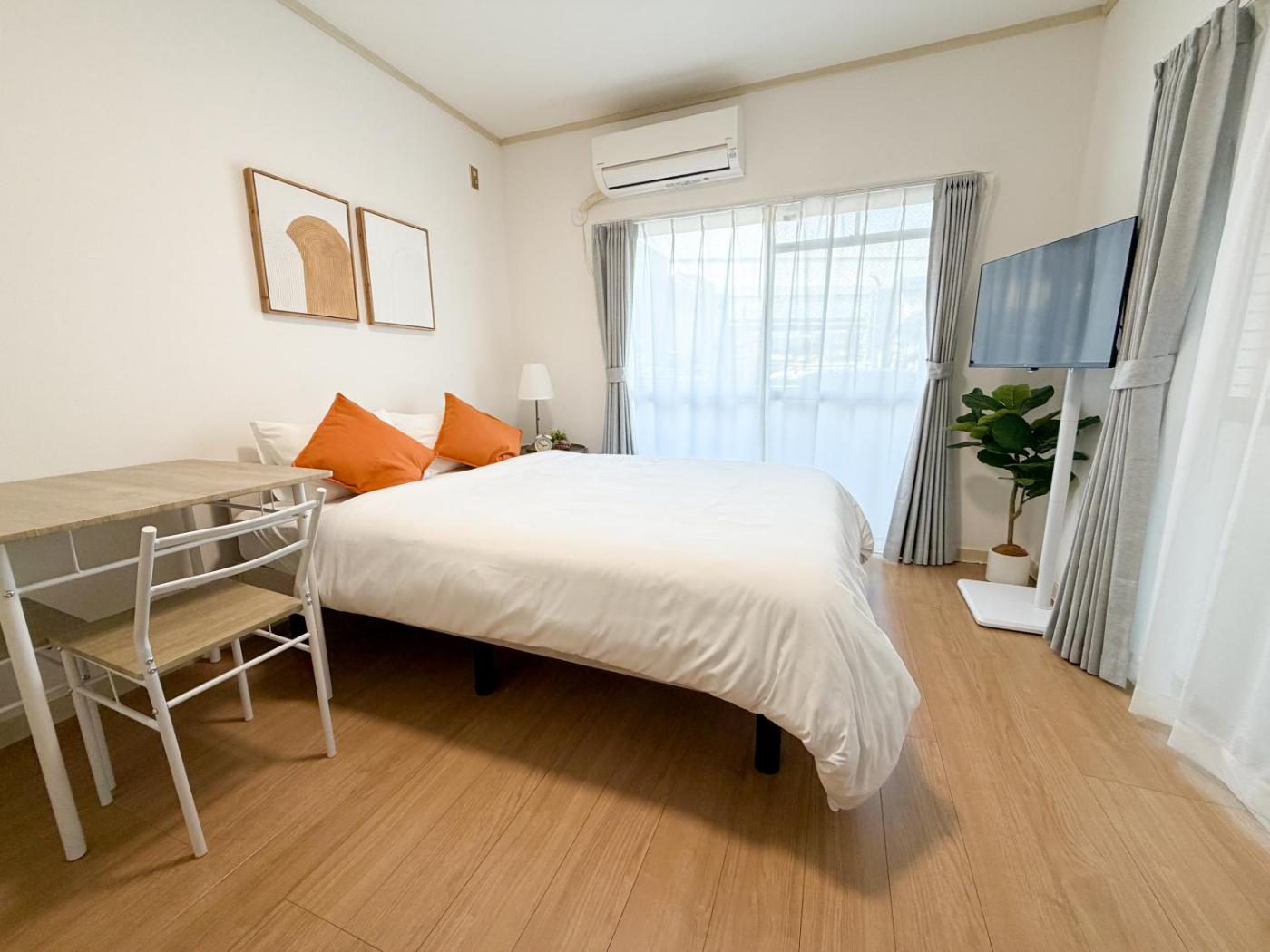 One-Bedroom Apartment. The air-conditioned apartment features 1 bedroom and 1 bathroom with a bath and a shower. Guests can make meals in the kitchen that is equipped with a refrigerator, kitchenware, a microwave and an electric kettle. This apartment has a washing machine, a wardrobe, a flat-screen TV with streaming services and a balcony. The unit offers 1 bed and 1 futon.