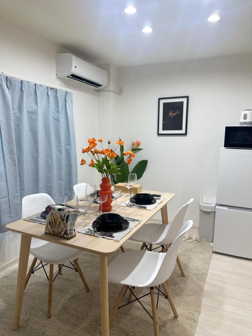 Three-Bedroom Apartment. This apartment offers a hot tub. The spacious apartment features 3 bedrooms and 1 bathroom with a bath or a shower and free toiletries. Meals can be prepared in the well-fitted kitchen, which comes with a refrigerator, kitchenware and a microwave. The air-conditioned apartment provides a flat-screen TV, a washing machine, tatami, a tea and coffee maker as well as a quiet street view. The unit offers 3 beds and 4 futons.