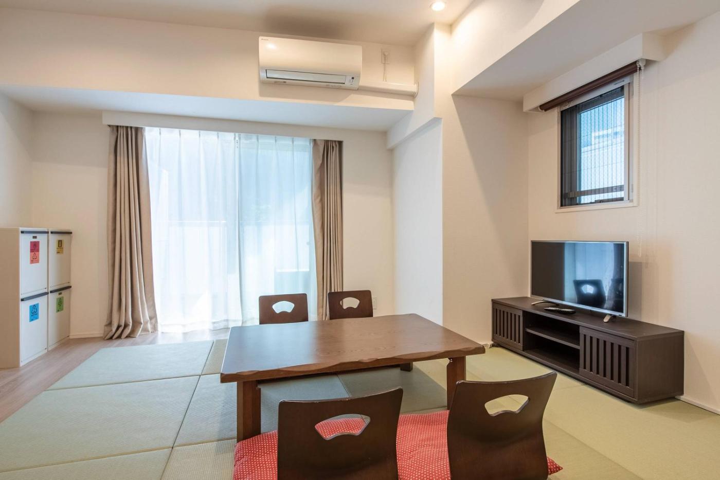 One-Bedroom Apartment. This apartment consists of 1 living room, 1 separate bedroom and 1 bathroom with a bath and free toiletries. Guests can make meals in the kitchen that is equipped with a stovetop, a refrigerator, kitchenware and a microwave. The apartment provides air conditioning, a washing machine, tatami, a dining area, as well as a flat-screen TV. The unit offers 2 beds and 3 futons. ;